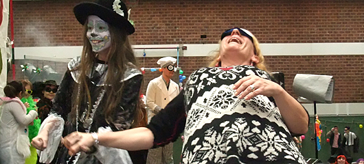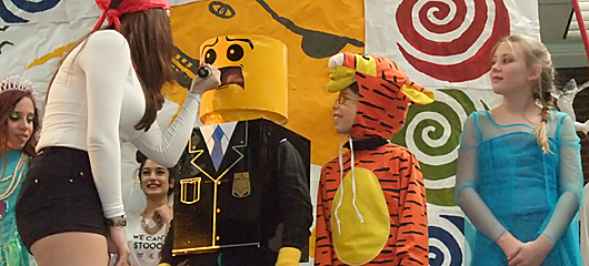 Ebenfalls ganz in der Tradition des EMG-Karnevals bekamen auch diesmal die Lehrer ihr Fett weg. Beim Lehrerparcours und dem „Lachenden Lama“ nutzten die Pauker ausgiebig die Gelegenheit, sich bis auf die Knochen zu blamieren. Wesentliche traditioneller ging es beim Besuch der Alt-Hürther Karnevals-Prinzessin Lilly zu, die zusammen mit kompletter Garde in vollem Ornat auftrat.