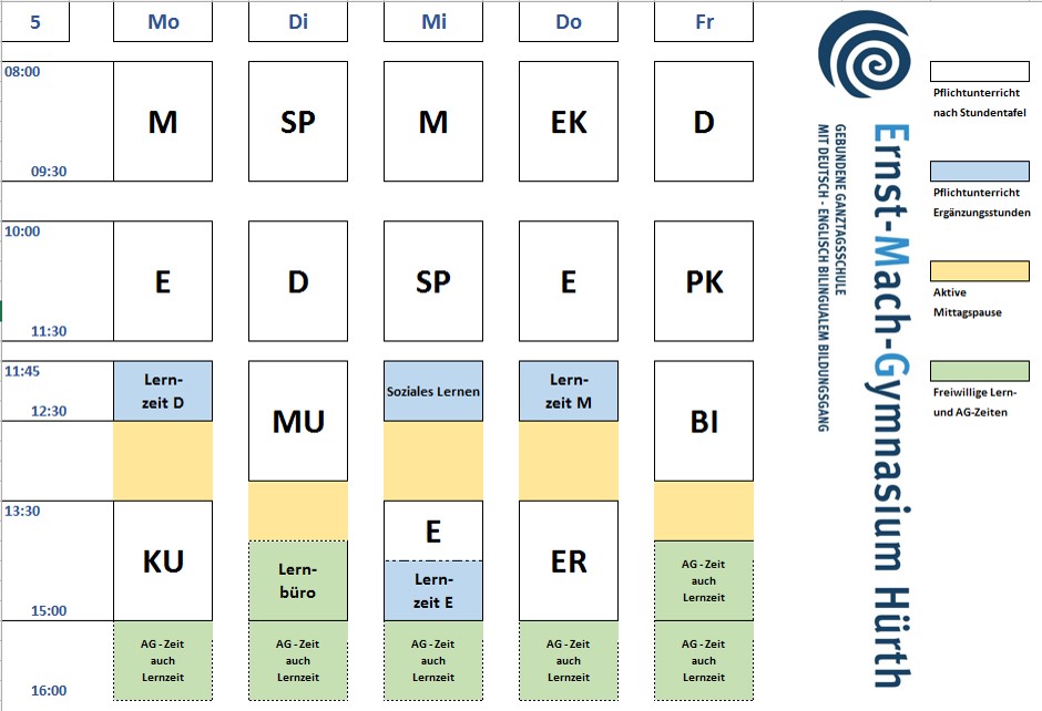 Im gebundenen Ganztag findet Unterricht an drei Tagen in der Woche von 8 Uhr bis 15 Uhr statt. Am EMG sind dies Montag, Mittwoch und Donnerstag. Dienstags und freitags endet der Unterricht um 13.15 Uhr.
